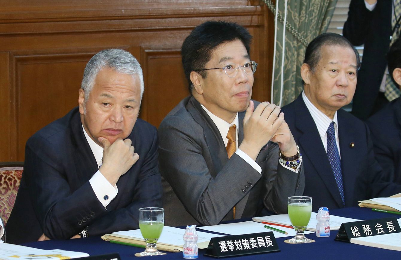 2018年10月30日、自民党の総務会に臨む(左から)甘利明選対委員長、加藤勝信総務会長、二階俊博幹事長。このうち加藤氏は「ポスト安倍」の有力候補とみられている(写真=時事通信フォト)