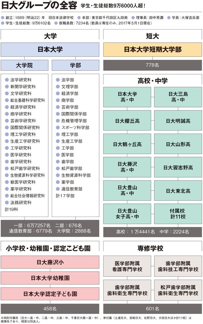 相手選手への悪質なタックルをめぐる日本大学アメフト部監督、コーチの会見(当時、写真上)。発祥の地である東京・神田三崎町周辺には、ところどころに日大の校舎や施設が存在する。(時事通信フォト=写真上中、AFLO=写真右下)
