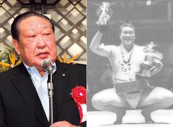 母校職員から出発し頂点に立った日大・田中英壽理事長(写真左)。過去には学生横綱(同右)、アマチュア横綱の座を獲得している。(時事通信フォト=写真左、AFLO=写真右)