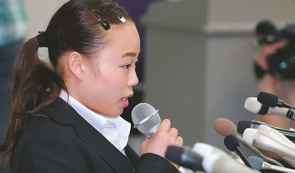 記者会見する体操の宮川紗江選手。スポーツ界で暴力をめぐる問題が相次いでいる。(時事通信フォト=写真)