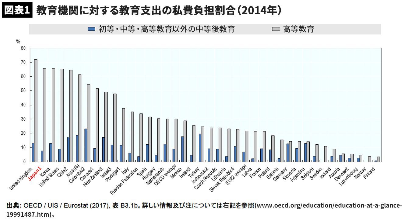 教育機関に対する教育支出の私費負担割合(OECD『図表でみる教育(Education at a Glance)OECDインディケータ 2017年版(カントリー・ノート:日本)』より引用)