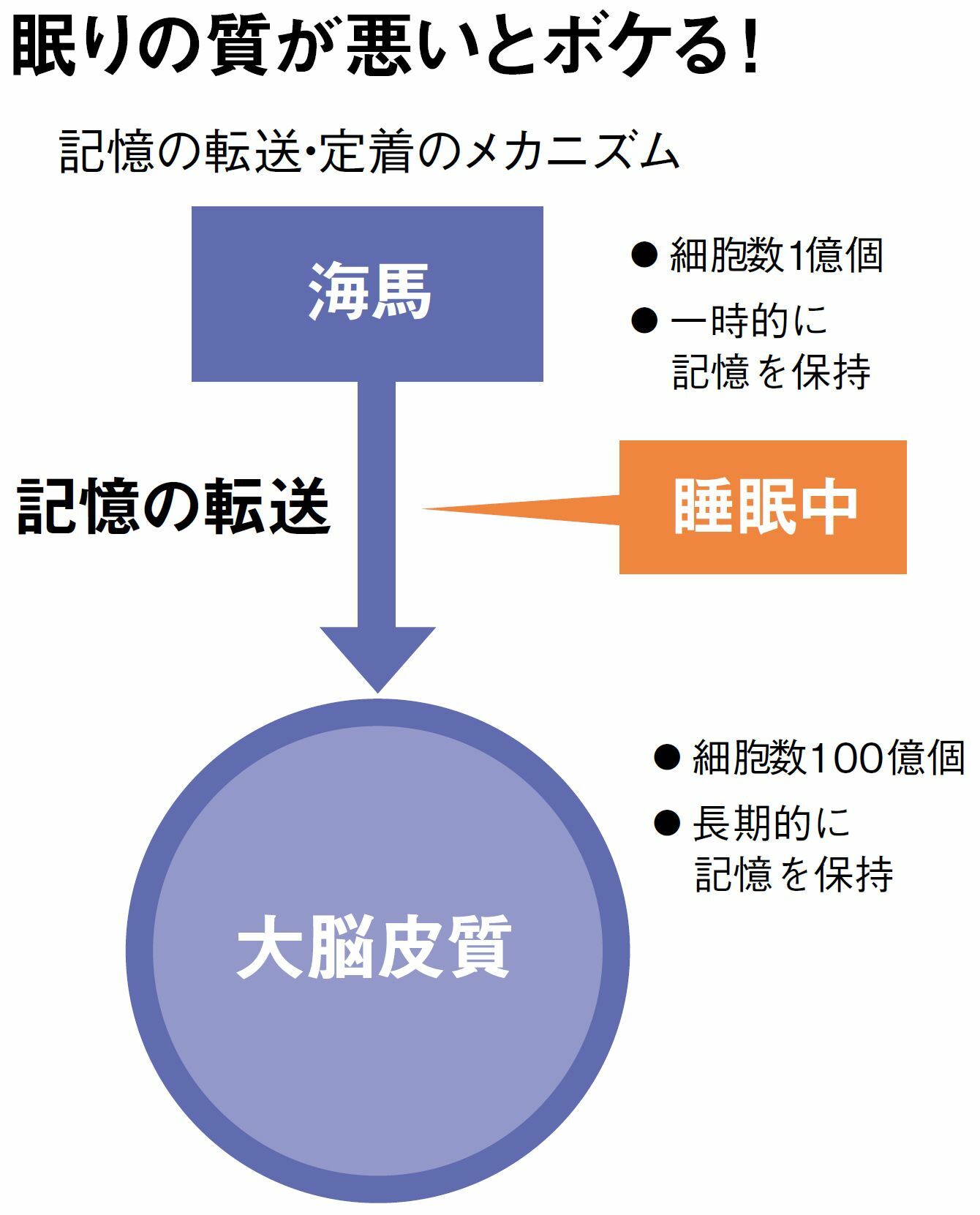 ※脳の海馬に一時的に蓄えられた記憶は睡眠中に大脳皮質へ転送される。この仕組みが健全に働かなければ、記憶は定着せず、やがて認知症になる。