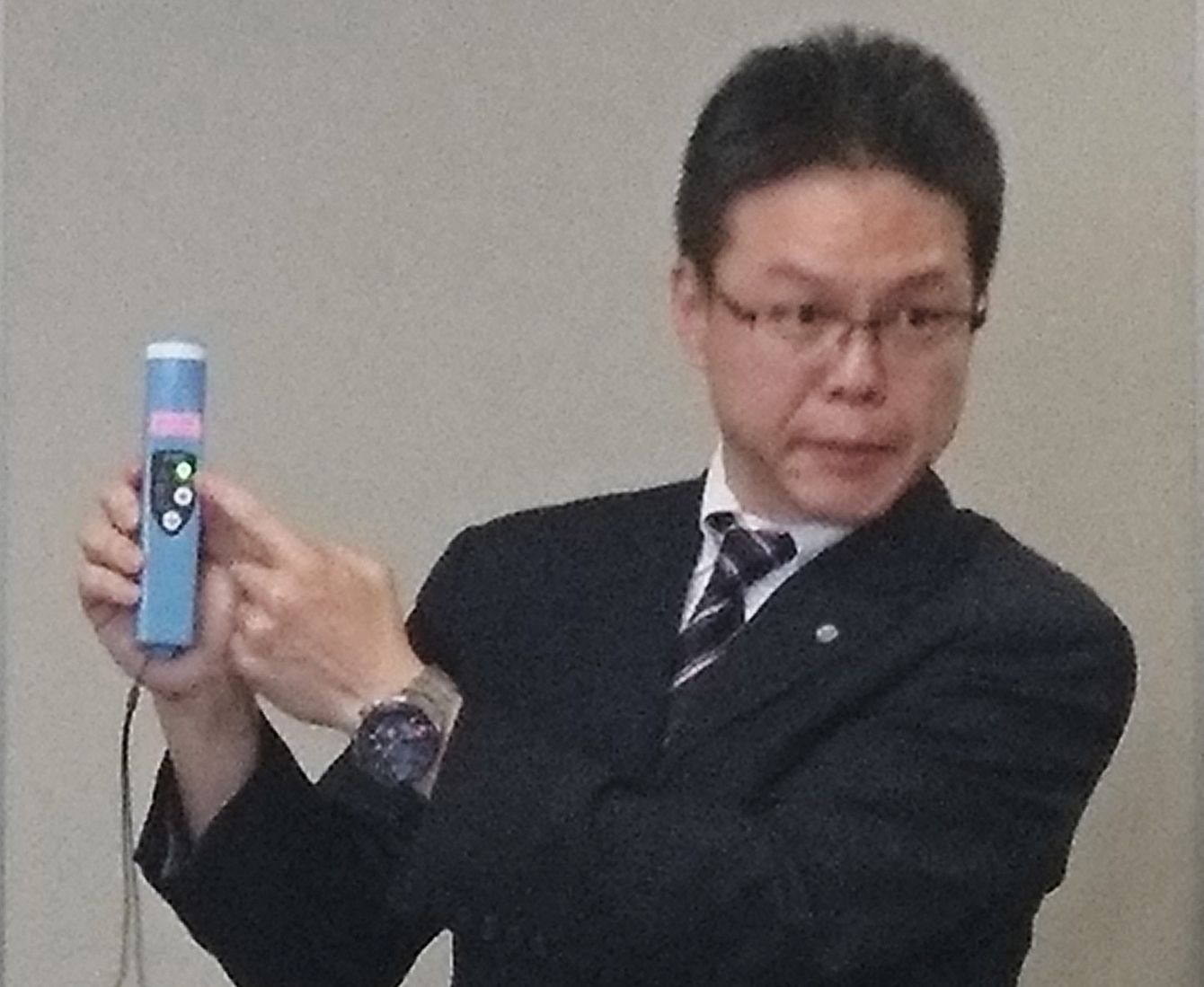 2018年11月1日、英国で拘束された副操縦士が使ったものと同型のアルコール感知器を説明する日本航空社員。(写真=時事通信フォト)