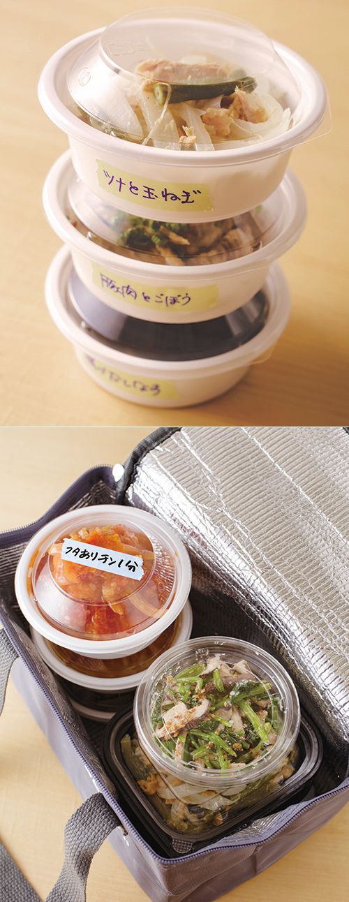 (1)透明な蓋はひと目で中身がわかり、食欲をそそる。側面に料理名を書けば、冷蔵庫から食べたいものをスムーズに取り出せる(2)つくった料理は冷ましてから冷蔵のクール便で送る(撮影=南雲保夫)