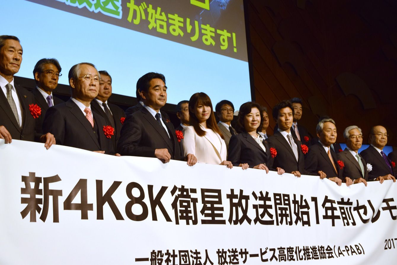 2017年12月1日、実用放送開始まで1年となり行われた新4K8K衛星放送開始1年前セレモニー。中央は推進キャラクターに任命された女優の深田恭子さん、右隣は野田聖子総務相(当時)(写真=時事通信フォト)
