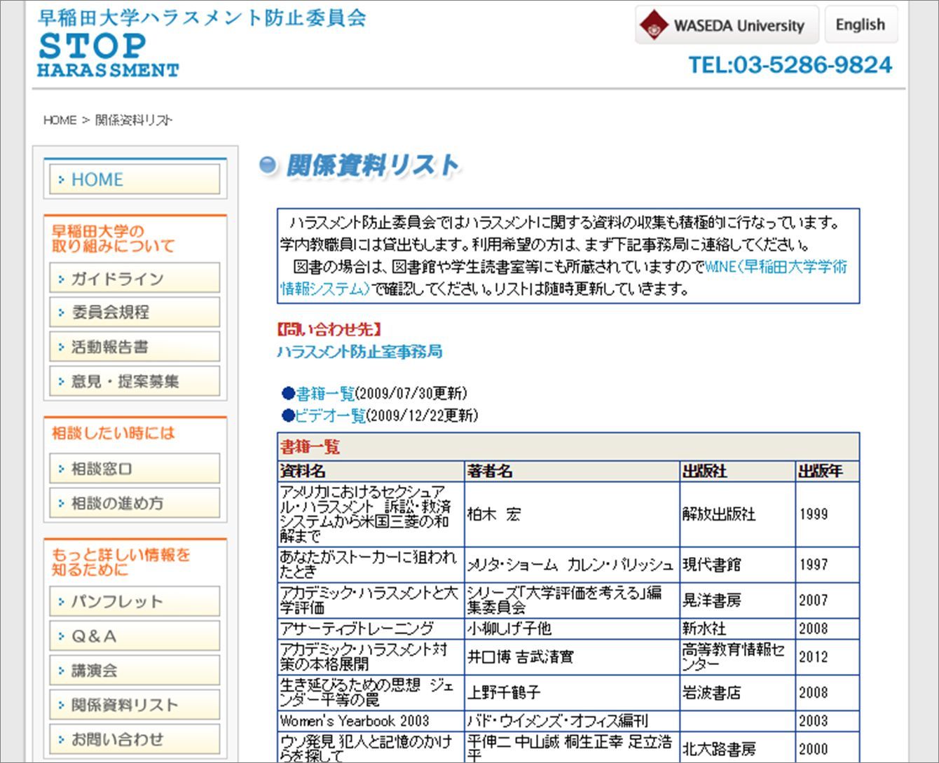 ハラスメント防止委員会のウェブサイトに掲示されている「関係資料リスト」。書籍一覧、ビデオ一覧ともに2009年で更新が止まっている(2018年11月16日閲覧)。