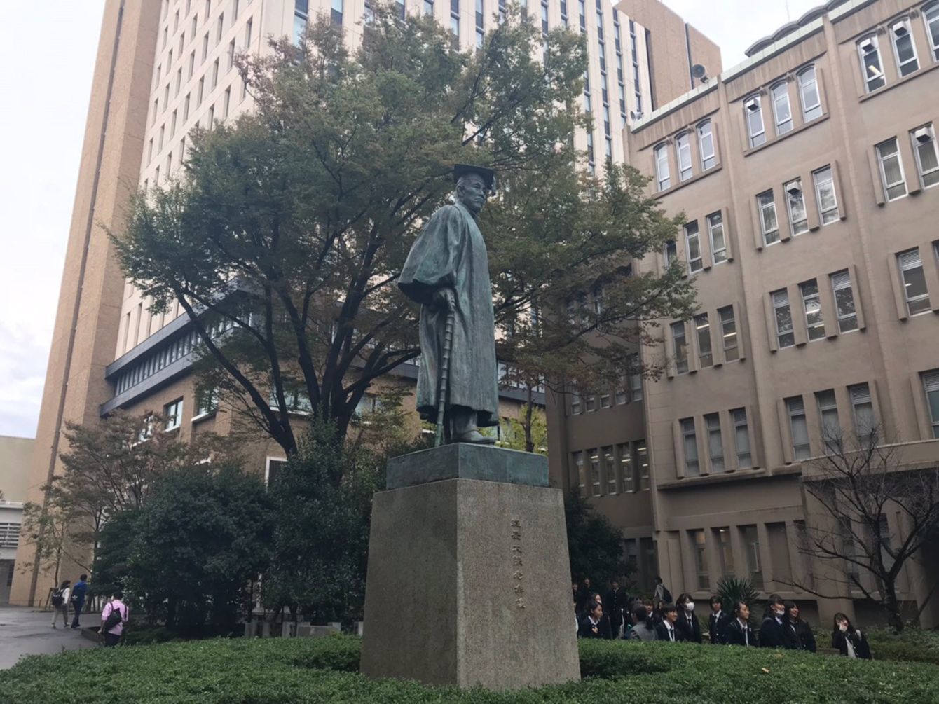 早稲田大学構内にある創設者・大隈重信の銅像。新宿区指定有形文化財となっている。(撮影=プレジデントオンライン編集部)