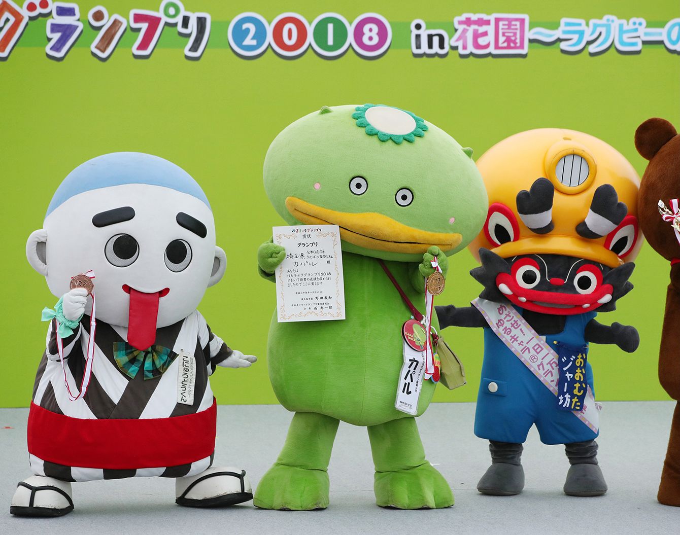 2018年11月18日、ゆるキャラグランプリで1位に選ばれた埼玉県志木市文化スポーツ振興公社の「カパル」(中央)(写真=時事通信フォト)