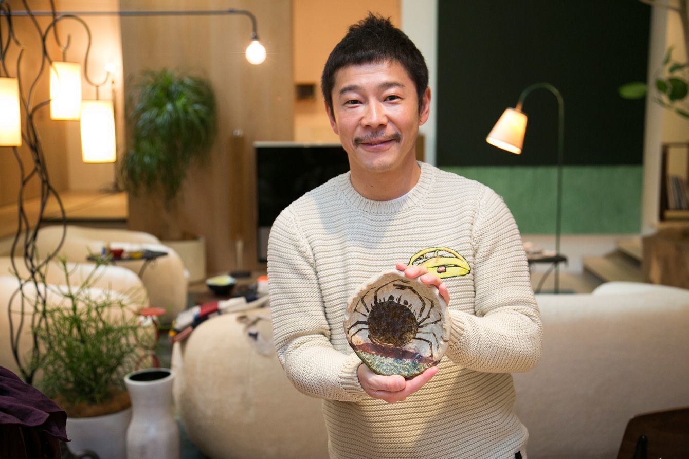 「北大路魯山人 蟹絵皿」を手に持つ前澤社長。(撮影=宇佐美雅浩)