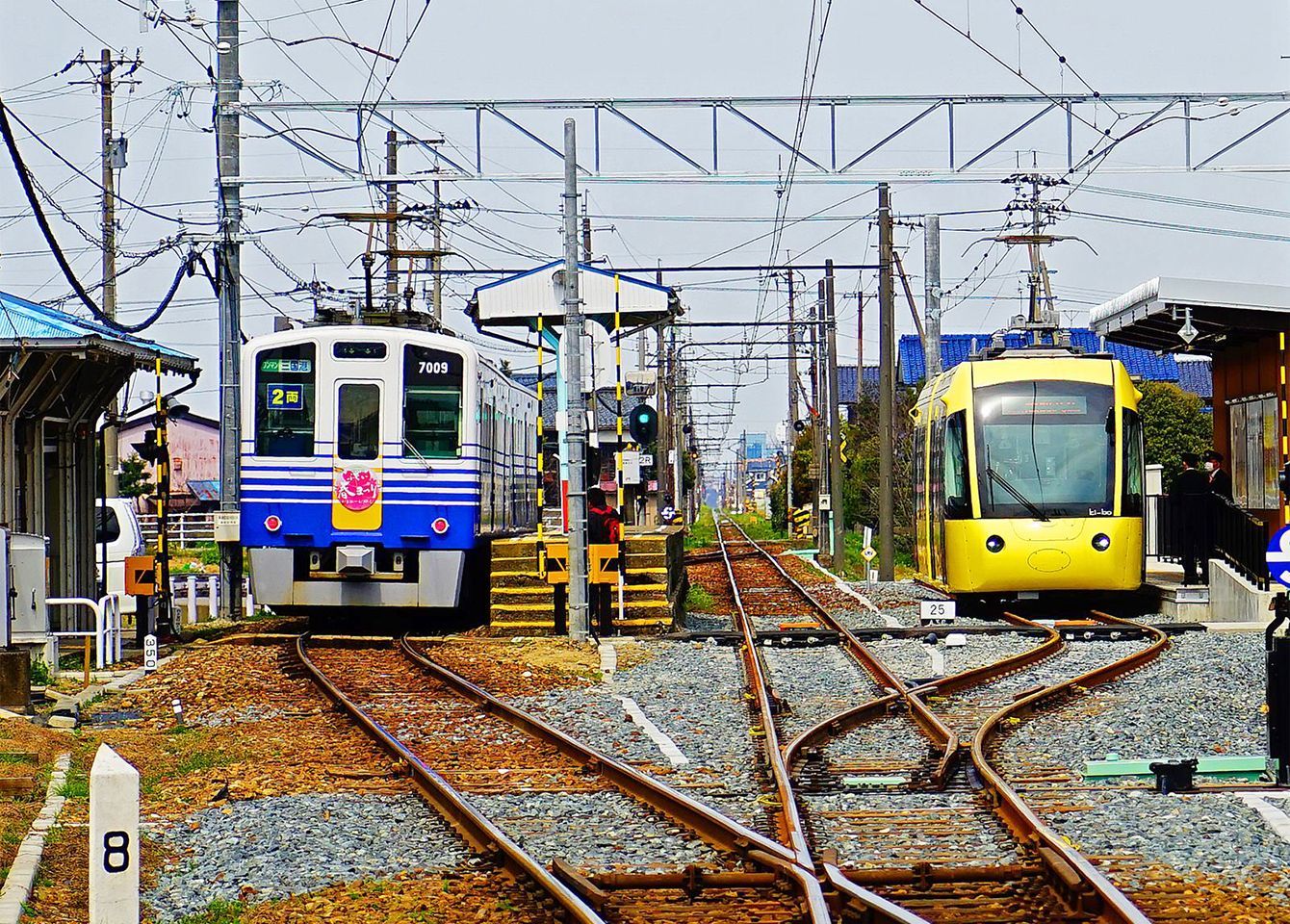 向かって右が福井鉄道と相互乗り入れしている「フェニックス田原町ライン」の車両で、愛称は「キーボ(Ki-bo)」。えち鉄の車両カラーの白は「新生(生まれ変わる)」、青は「沿線を流れる九頭竜川」、黄色は「安全・安心、温かみ」をイメージしている。(写真提供=えちぜん鉄道)