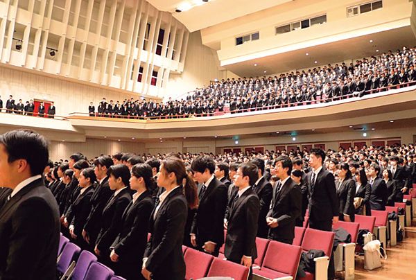 「出陣式~就職活動直前セミナー~」の最後は全員で校歌を斉唱。熱気に包まれる。(写真下)