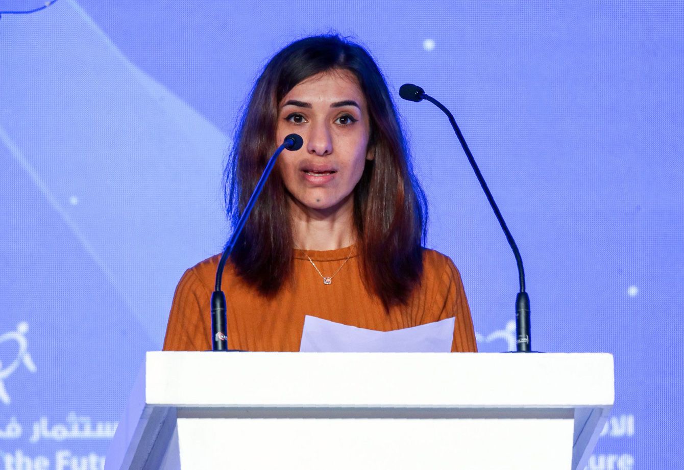 2018年10月24日、アラブ首長国連邦のシャルジャで行われた国際会議で、スピーチを行ったナディア・ムラドさん(写真=AFP/時事通信フォト)