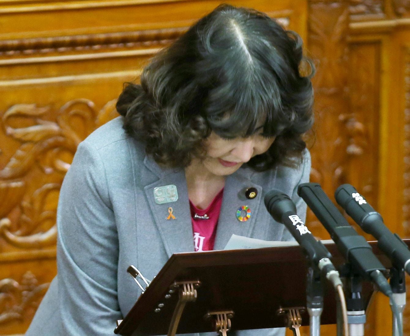 2018年10月31日、参議院本会議で、週刊文春が報じた「口利き」疑惑について陳謝する片山さつき地方創生担当相。(写真=時事通信フォト)