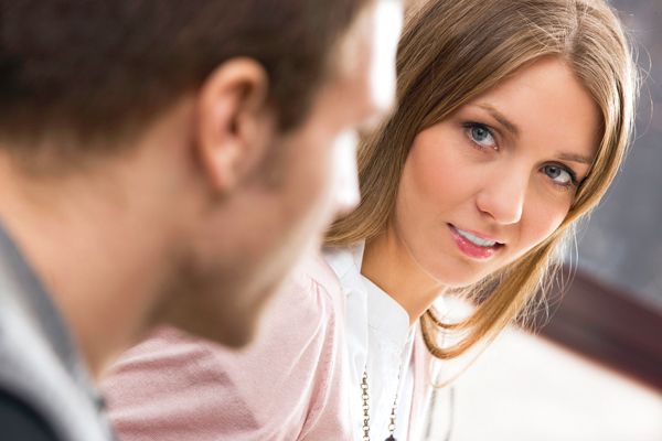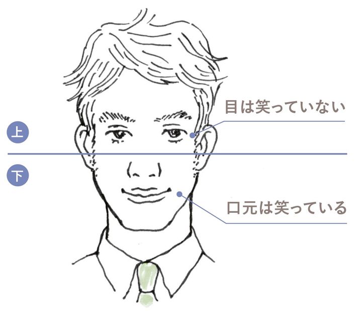 ウソをついている人は、先に顔の下半分(口元)の口輪筋が動いて笑い、一瞬遅れて上半分(目元)の筋肉が動いて笑顔になる。(イラスト=フジマツミキ)