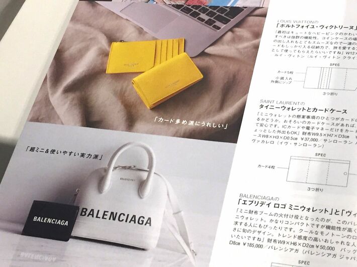 女性誌『クレア』(2018年12月号)ではイブ・サンローランやバレンシアガなど高級ブランドのミニ財布を誌面で紹介している。