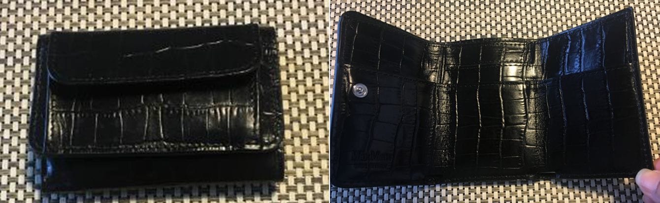 筆者の私物のミニ財布。三つ折りタイプで、最低限のキャッシュとカードを入れた状態で縦7.5cm×横11cm×幅3~4cm程度。広げた時のサイズは、タテ11cm×ヨコ21cm。