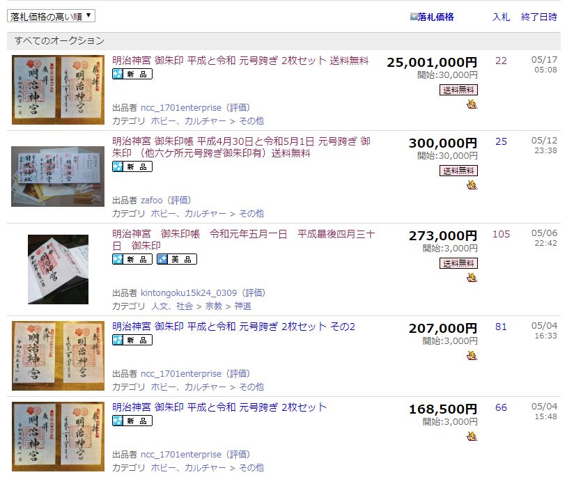 」の落札相場を調べた結果。最高落札価格は「2500万1000円」となっているが、この入札はイタズラで取引は成立していないようだった。
