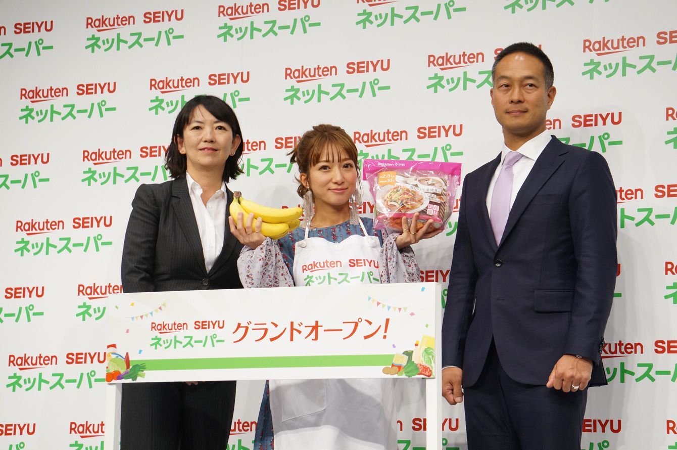 「楽天西友ネットスーパー」グランドオープン記者会見に登壇した、西友の竹田珠恵執行役員とタレントの辻希美さん、楽天の小森紀昭執行役員(写真左から/編集部撮影)