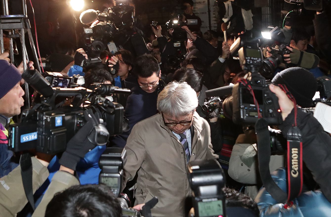 2018年12月20日、報道陣に囲まれて東京拘置所を出る日産自動車前会長カルロス・ゴーン容疑者の弁護人の大鶴基成弁護士(中央)(写真=時事通信フォト)