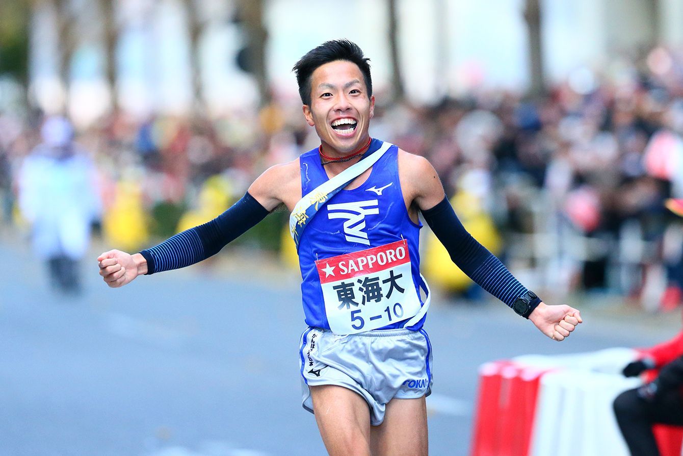 両角監督の声かけに応え、10区を快走し、ゴールテープを切った東海大の郡司陽大選手(写真=西村尚己/アフロスポーツ)