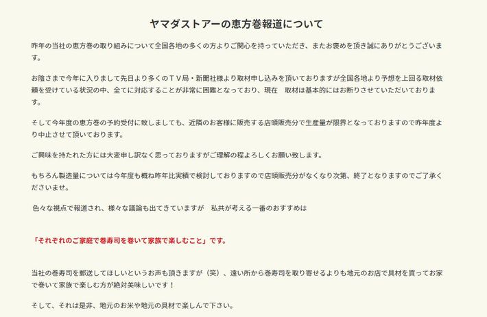 ヤマダストアーが掲載した「ヤマダストアーの恵方巻報道について」という文書の一部。同社ウェブサイトより。