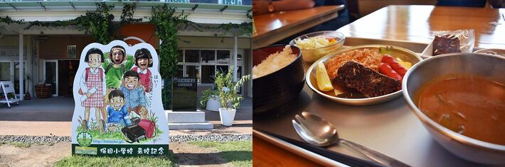 道の駅 保田小学校の様子。顔ハメパネル(左)と給食風の食事メニュー(右)。(写真提供=「若者と旅」座談会メンバー)