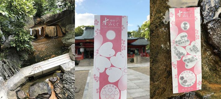 生田神社の水みくじ。境内の池におみくじを浸すと、運勢が浮き上がる仕組み。((写真提供=「若者と旅」座談会メンバー))