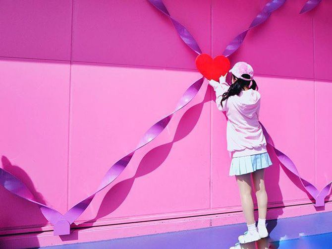 USJの「ハローキティのリボン・コレクション」の壁。インスタ映えで人気だという。(写真提供=「若者と旅」座談会メンバー)
