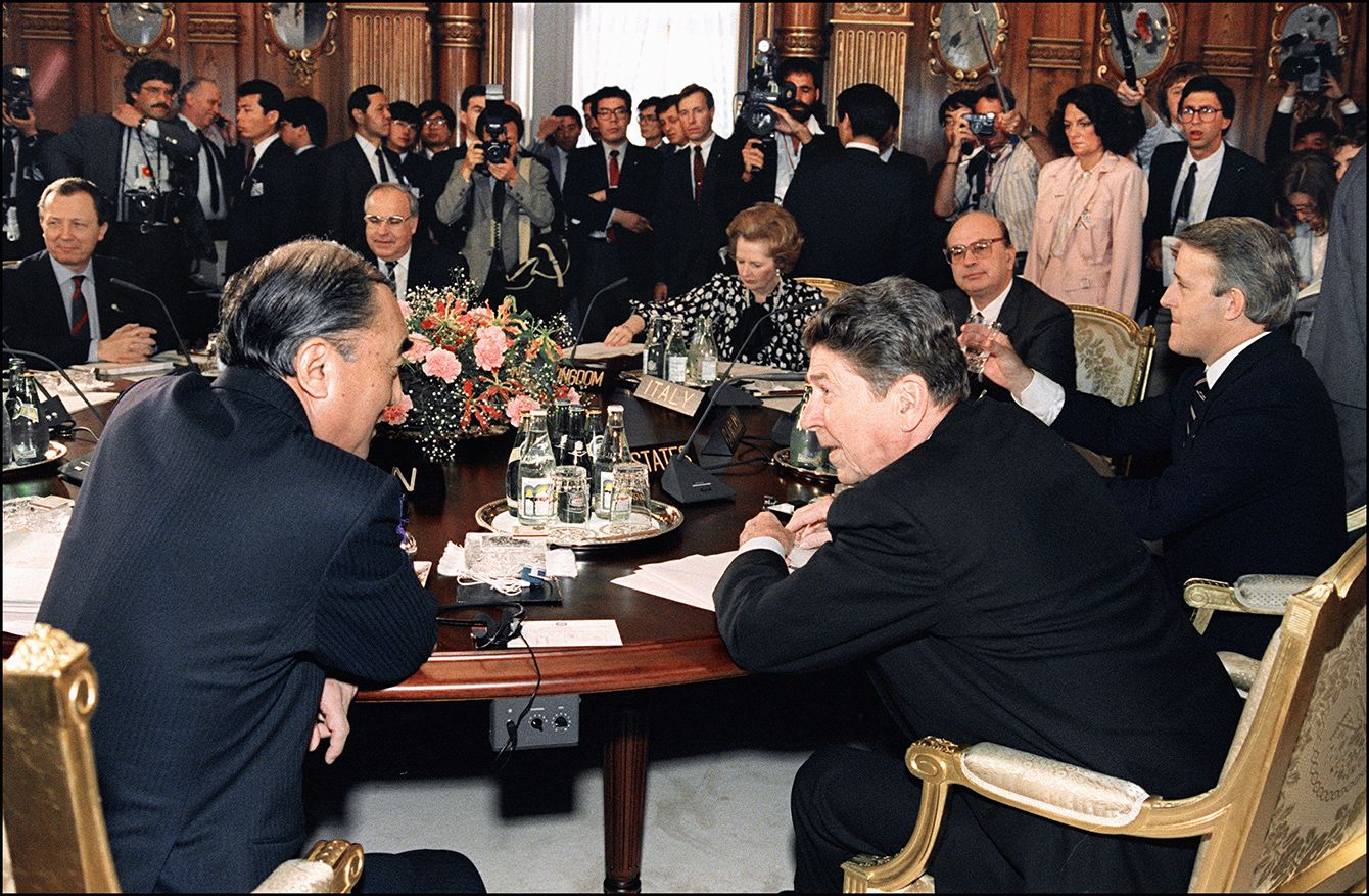 洋の東西を問わず、役人は文章の表現にきわめて厳格で、文章が大切だというコンセンサスがある――久保田氏が各国の高級官僚と共にサミット宣言の原案作成に参加した、1986年の東京サミットの一場面(写真=AFP/時事通信フォト)