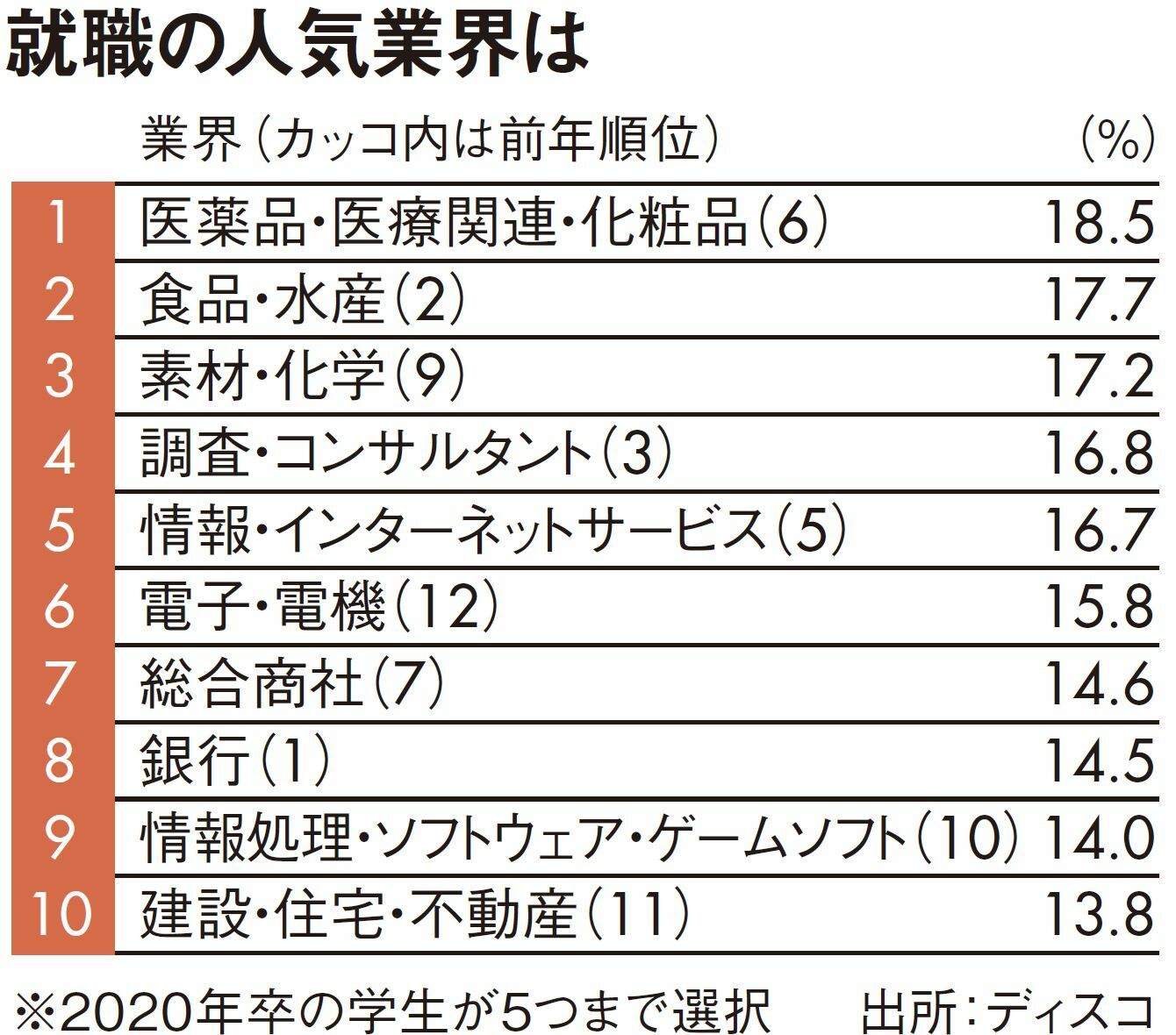 2020年卒の学生"就職人気業界トップ10"