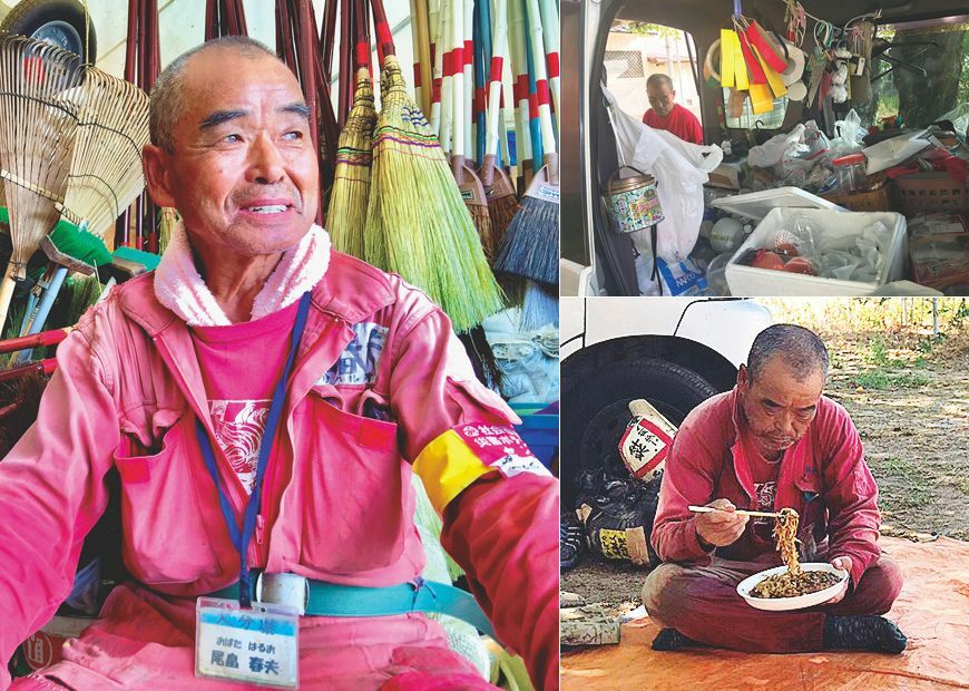 左:この笑顔に被災者は癒やされる。右上:尾畠さんの車内。右下:差し入れでもらった広島風お好み焼きを頬張る。