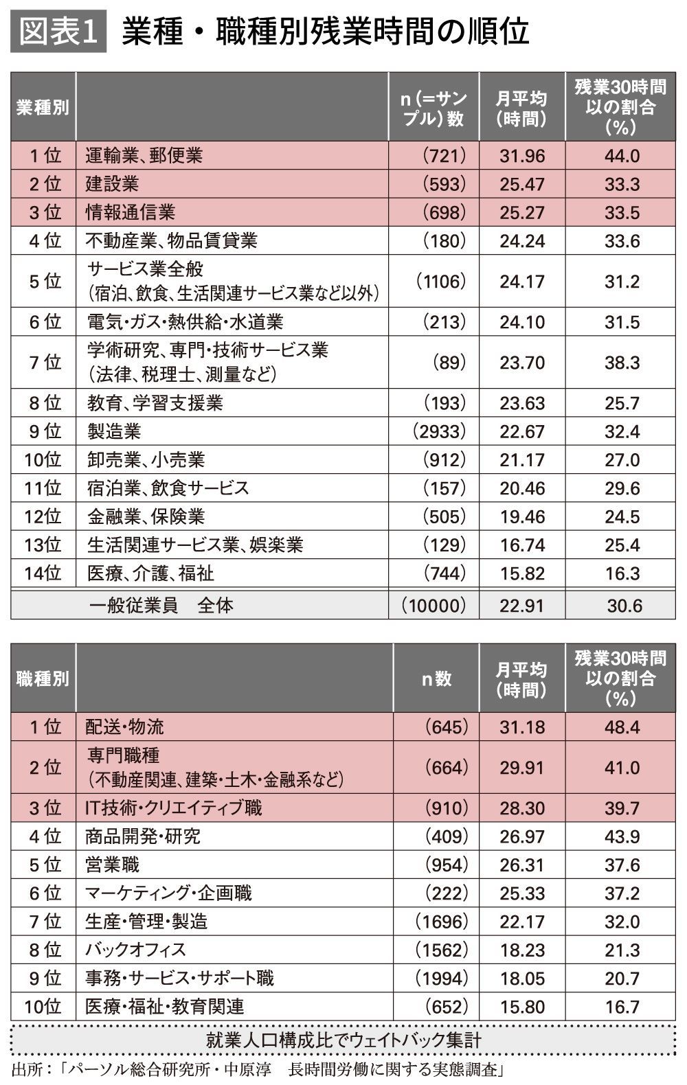 業種・職種別「サービス残業ランキング」