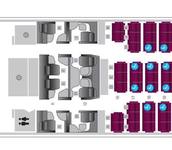 機内の席配置。グレーがビジネスクラスで、紫がエコノミークラス。ビジネスクラスの中央座席では仕切りを外すと、4人が向かい合わせに座ることができる。