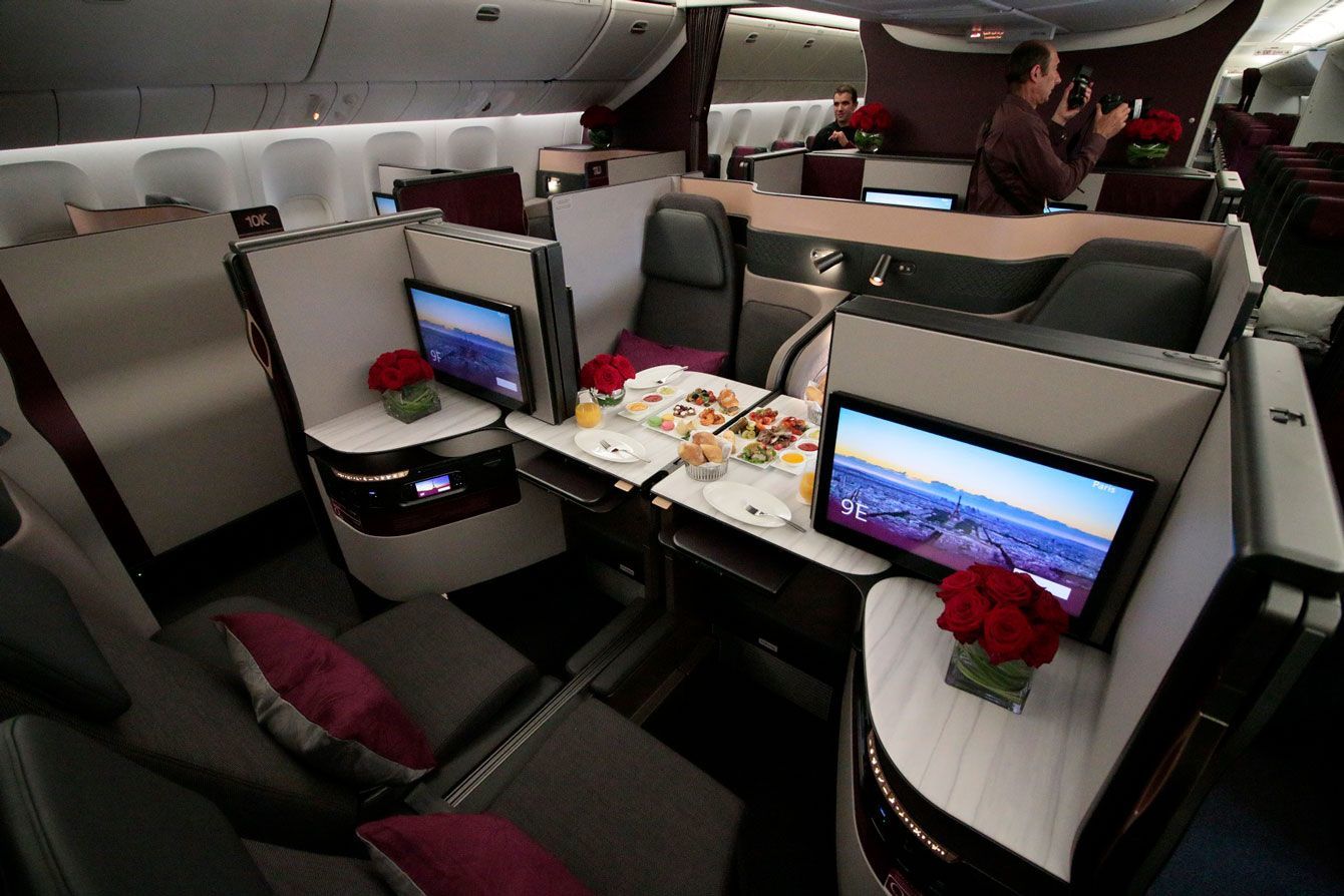 機内の席配置。グレーがビジネスクラスで、紫がエコノミークラス。ビジネスクラスの中央座席では仕切りを外すと、4人が向かい合わせに座ることができる。