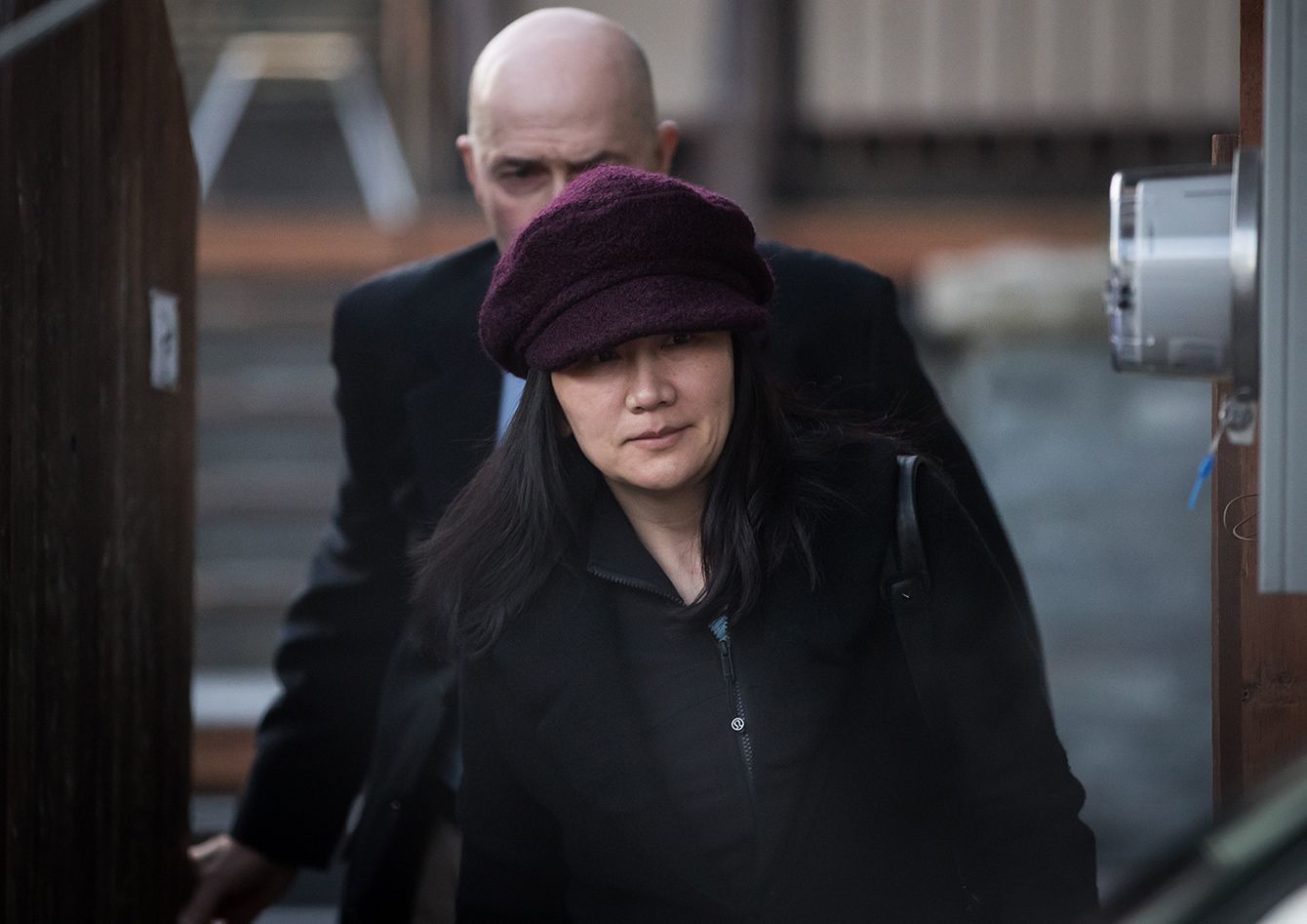 裁判所に出廷するため自宅を出るファーウェイの孟副会長兼CFO