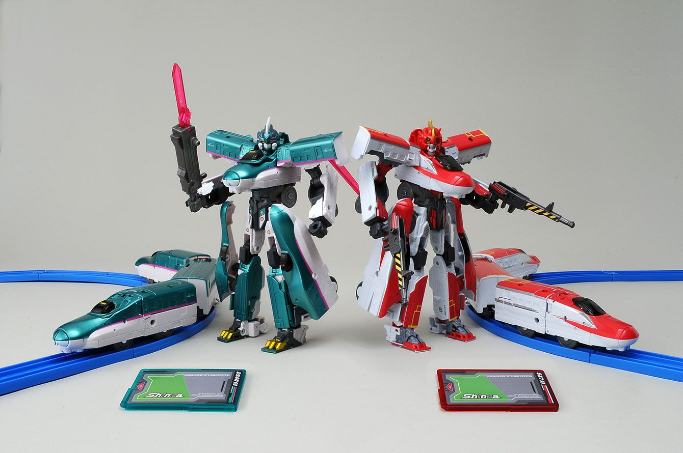 「DXS01 シンカリオン E5はやぶさ」と「DXS02 シンカリオン E6こまち」(画像提供=タカラトミー)