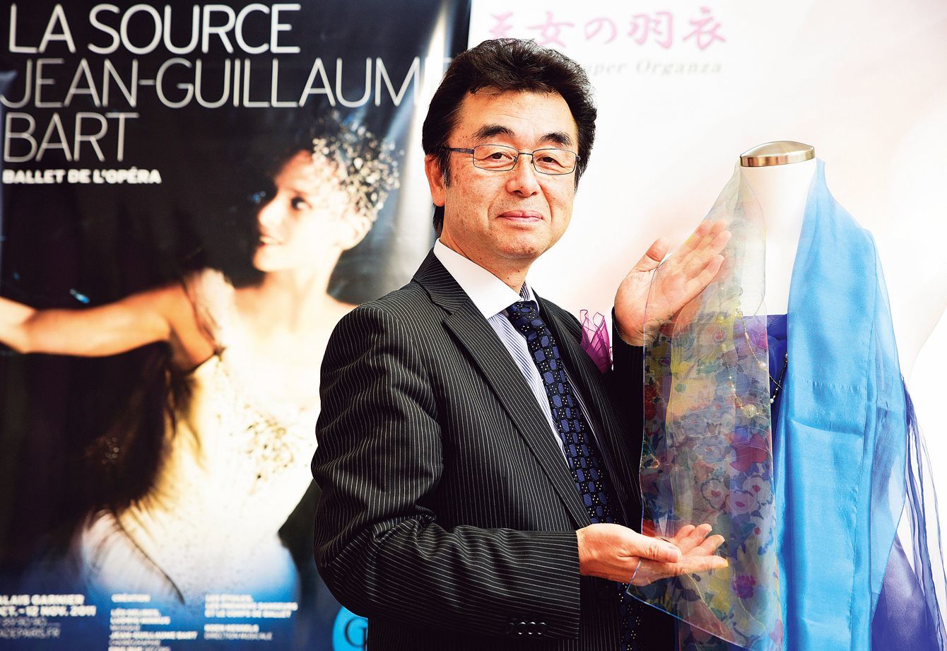 「天女の羽衣」のスカーフ、ショール(写真上)。水の噴射力で緯糸を挿入する織機「ウォータージェットルーム」(同下)。