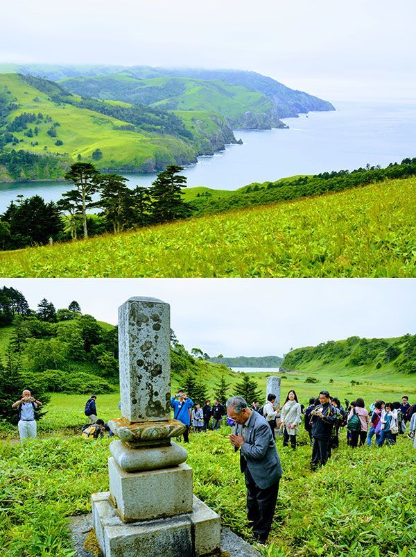 (下)色丹島の日本人墓地で手を合わせる元島民