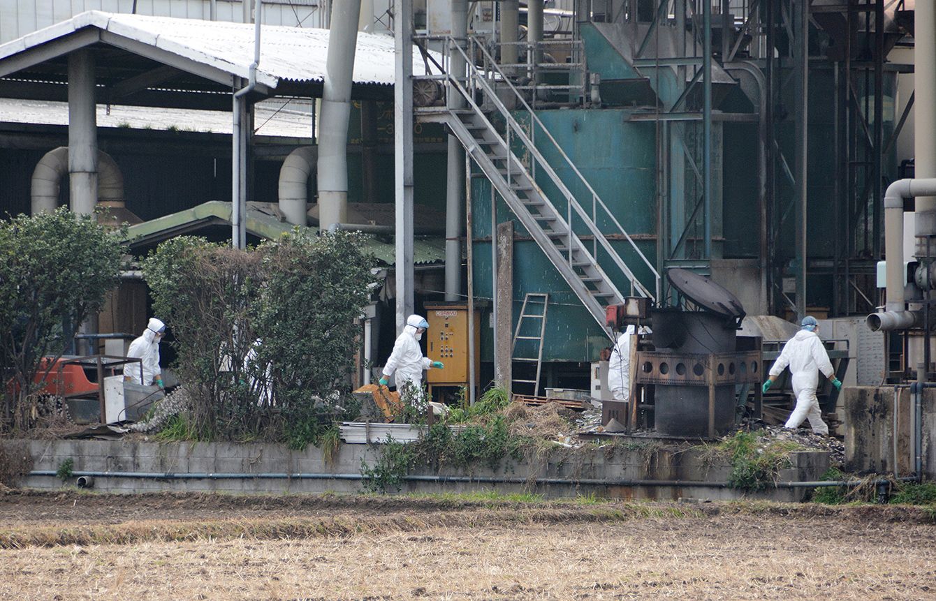 豚コレラ発生現場で作業する職員ら=2019年2月7日、愛知県豊田市(写真=時事通信フォト)