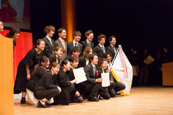 「掃除大賞2018」の様子。前年に大賞を受賞した九州木材工業の角博社長が大賞旗を返還。