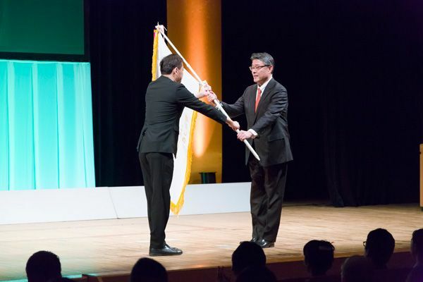 「掃除大賞2018」の様子。前年に大賞を受賞した九州木材工業の角博社長が大賞旗を返還。