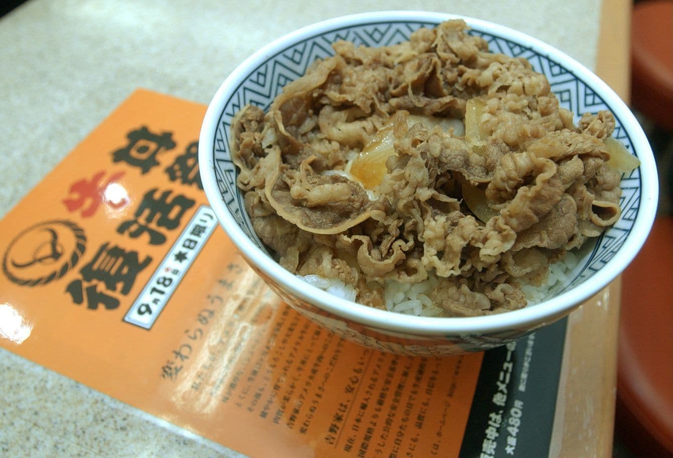 2006年9月18日、米国産牛肉の輸入再開に先がけ、1日限定で復活した吉野家の牛丼(東京・有楽町)(写真=時事通信フォト)