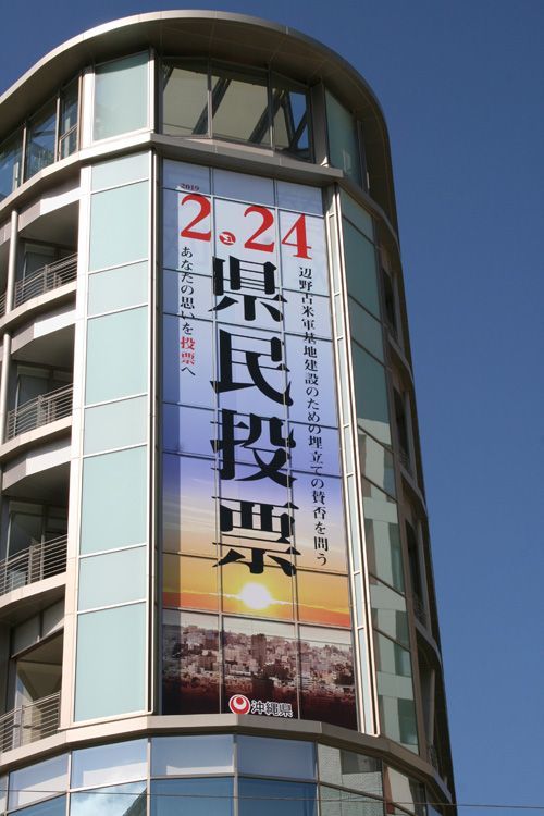 地元紙・琉球新報社の社屋の壁面には「2.24 県民投票」の告知が(写真=古木杜恵)