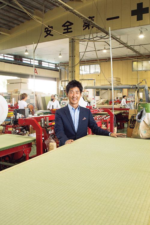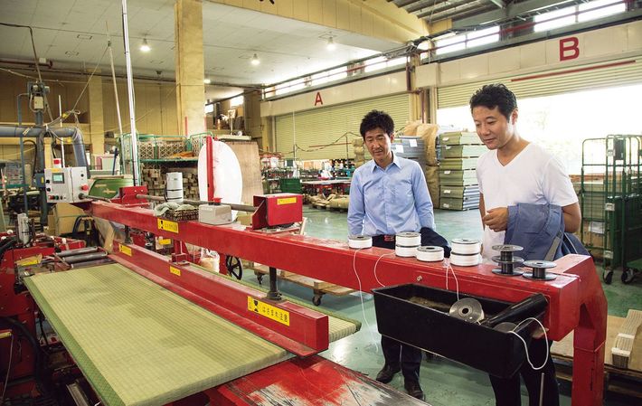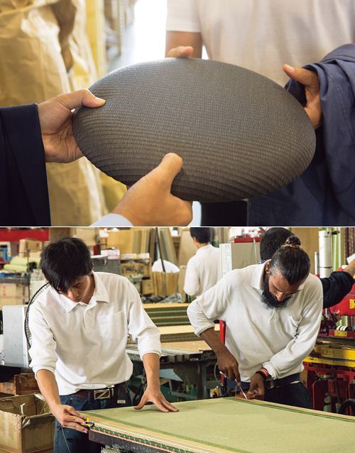(写真上)ヒーリング効果のあるい草をつかった商品開発も進める。(下)一点一点サイズを調整しながら仕上げていく。
