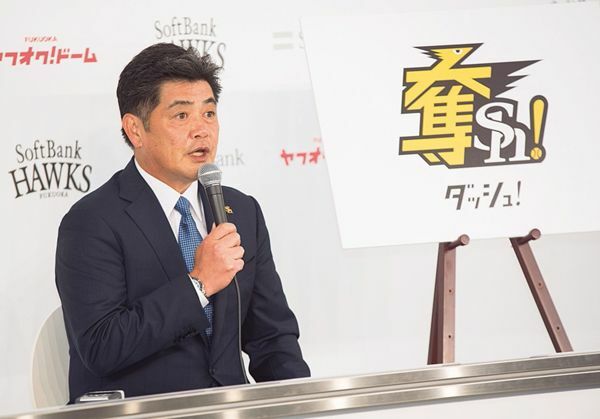 2019年のスローガン、「奪Sh!(ダッシュ!)」には、リーグ優勝奪還と日本一への想いがこもる(2018年12月21日、ヤフオク!ドーム)。(時事=写真)