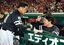 日本シリーズを制覇し、言葉を交わす工藤公康監督(左)と甲斐拓也捕手(2018年11月3日、マツダスタジアム)。(時事=写真)