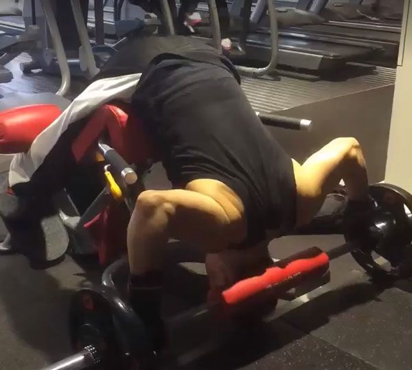 英ボディビルダーのドリアン・イエーツ考案の「ハイパーエクステンション」を30kgバーベルで実践する談慶氏。背筋に効く