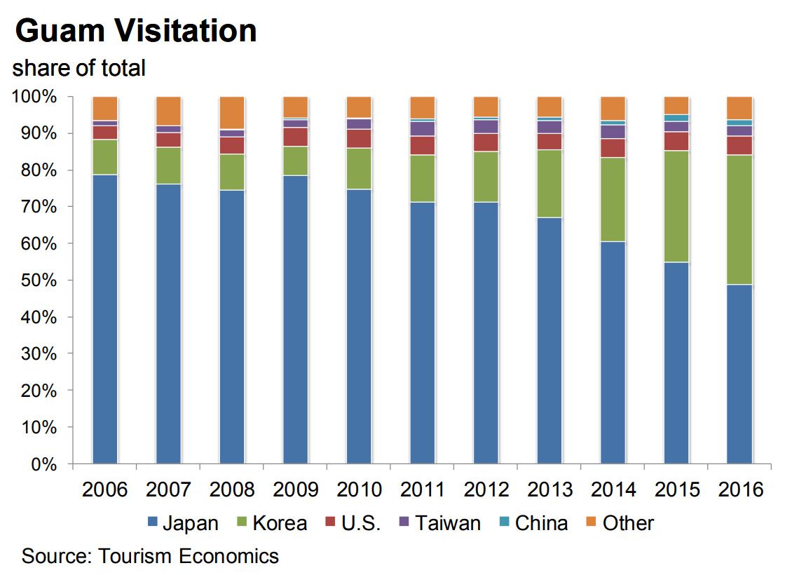 グアム政府観光局「The Economic Impact of Tourism on Guam」(2016)より抜粋。日本の占め得る割合が減りつづけていることがわかる。