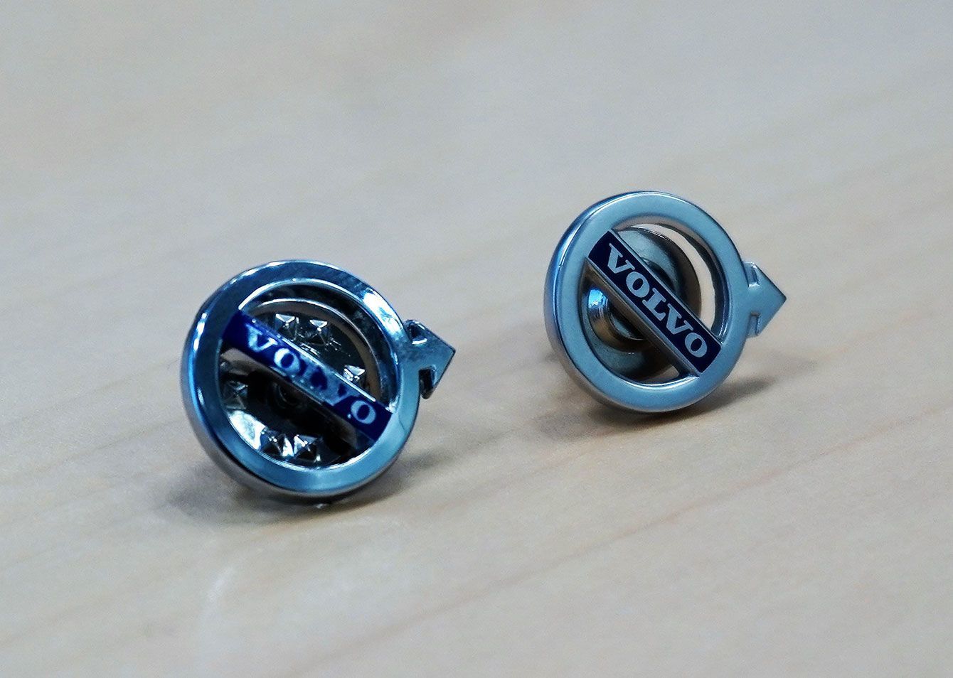 スーツに付けるピンバッジ。右が新たにつくったもの。左はこれまで使われていたもの。専用品ではなく、簡素なつくりだった。