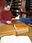 完成した中世ラテン語辞書を手にとるリチャード・アシュダウン氏。プロジェクトの最後の編集長を務めた。(撮影=小倉孝保)